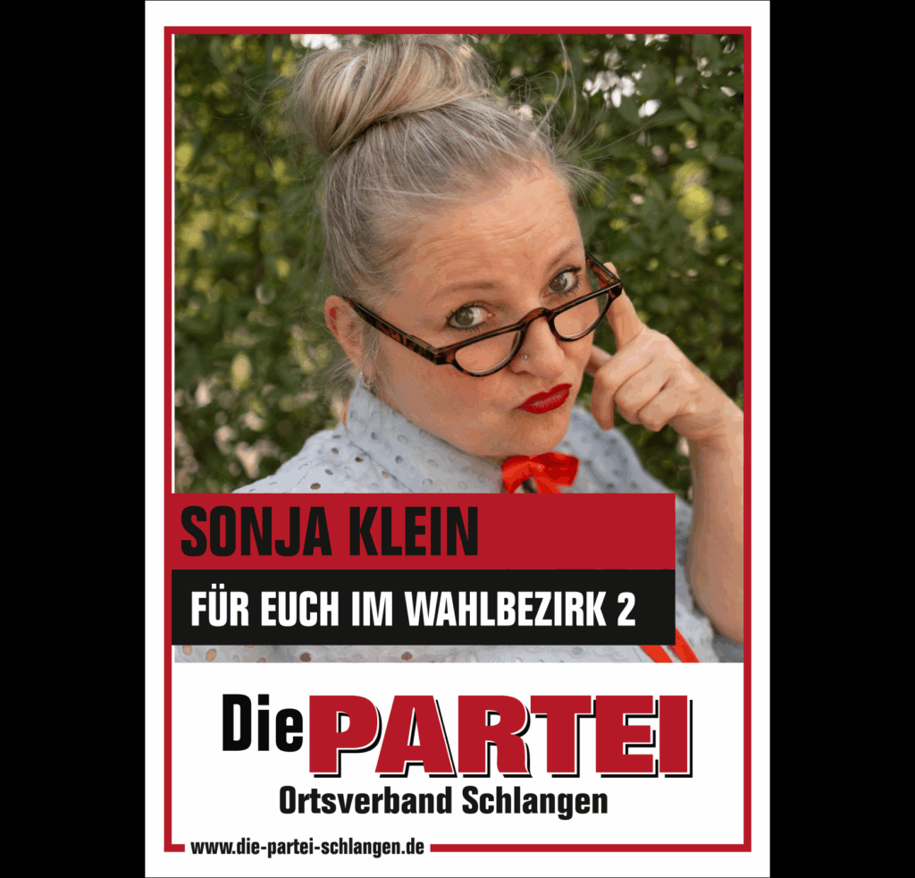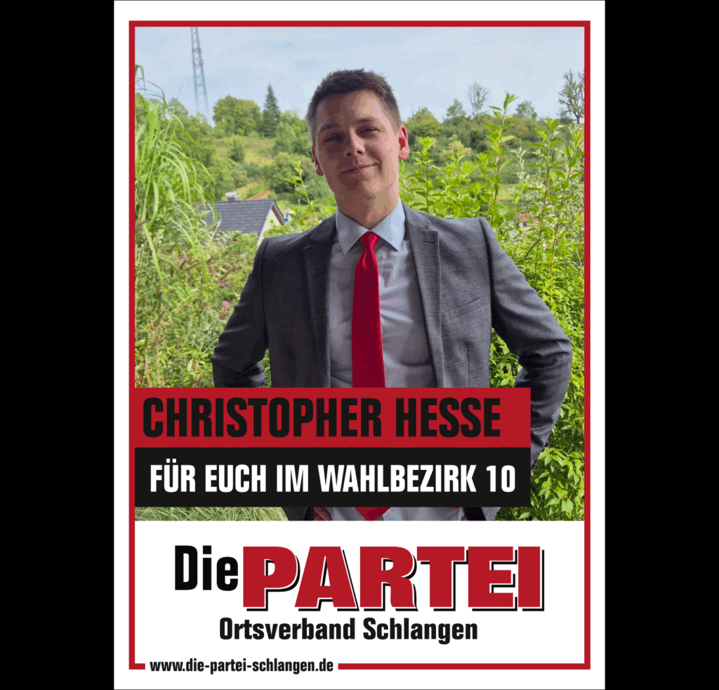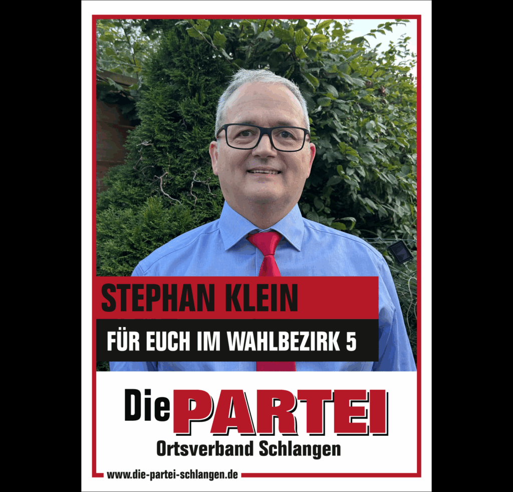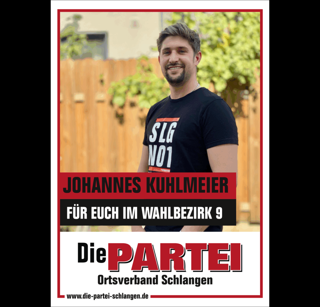 Mit Beginn der Legislaturperiode ist Die PARTEI im Schlänger Gemeinderat vertreten. Die Fachausschüsse und Drittorganisationen haben wir mit unseren Mandatsträgen sowie sehr kompetenten Sachkundigen Bürgern:innen besetzt.